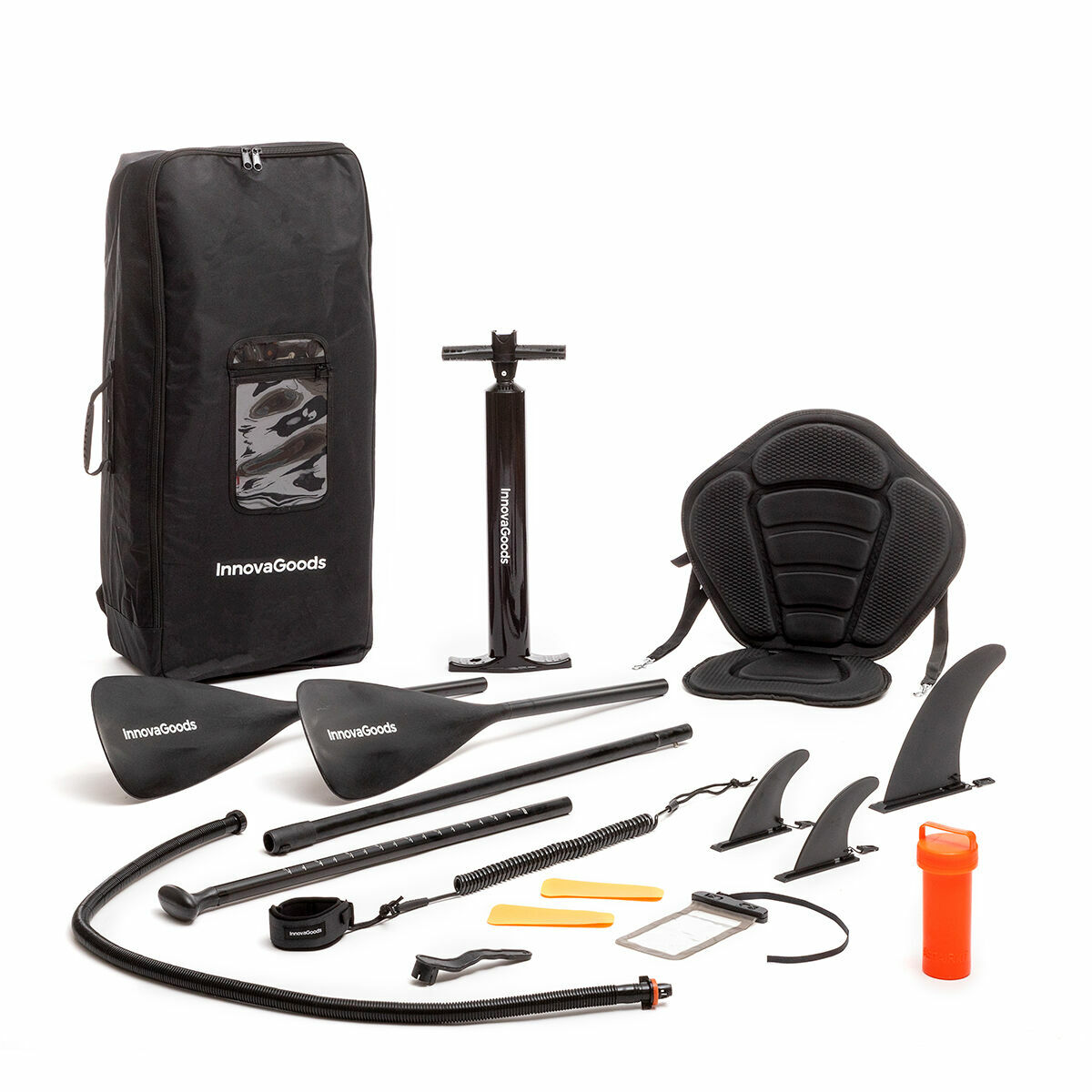 - Sitz und Zubehör: Abnehmbarer Sitz mit Rückenlehne (51 x 73 cm), 3 abnehmbare Finnen; zerlegbares und einstellbares Doppelpaddel (200-230 cm); Leine: Sicherheitsseil für den Knöchel; Befestigungs- und Aufbewahrungsgurt; wasserdichte Handytasche; Transportrucksack; Handpumpe mit Manometer; Reparaturset.